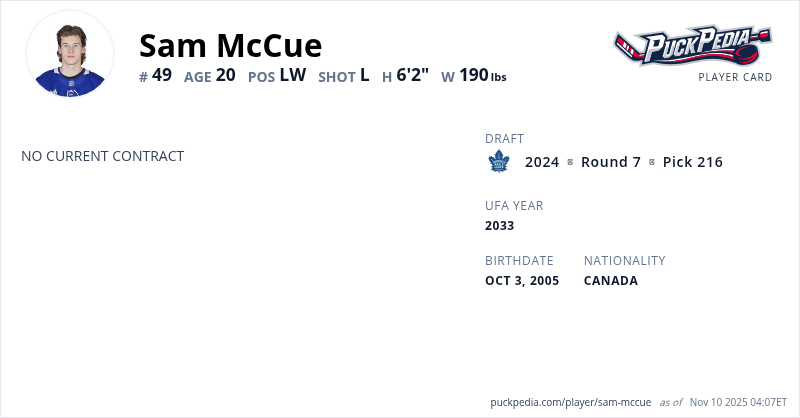 | 2023-24 | 18 | OHL | Owen Sound Attack | 34 | 12 | 9 | 21 | 28 | Playoffs | 4 | 0 | 1 | 1 | 0 | ||||||||||||||||