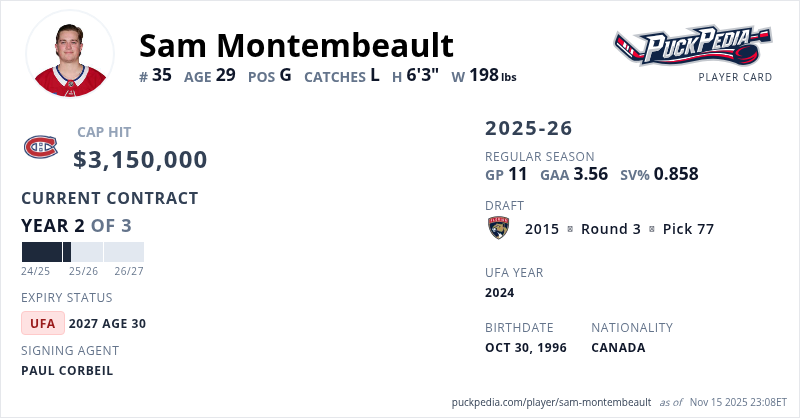 Sam Montembeault is signed to a 3 year, $9,450,000 contract with a cap hit of $3,150,000 per season, playing for the Montreal Canadiens. His contract expires at the end of the 2026-27 season, making Montembeault an Unrestricted Free Agent.