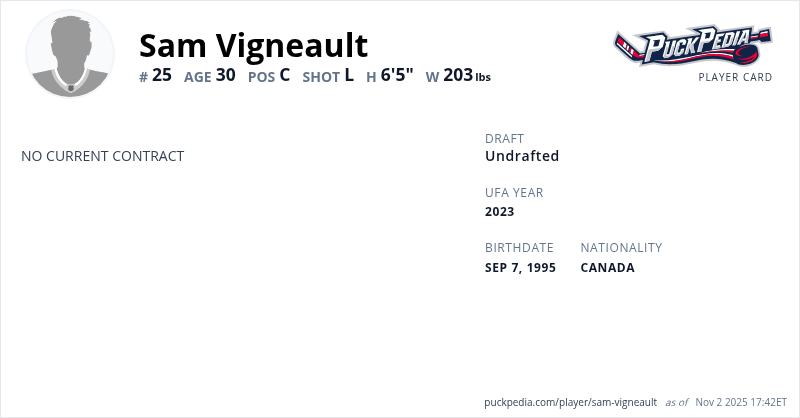 Sam Vigneault is an Unrestricted Free Agent. His last contract was 2 years, $1,850,000 with a cap hit of $925,000 per season. It expired at the end of the 2018-19 season.
