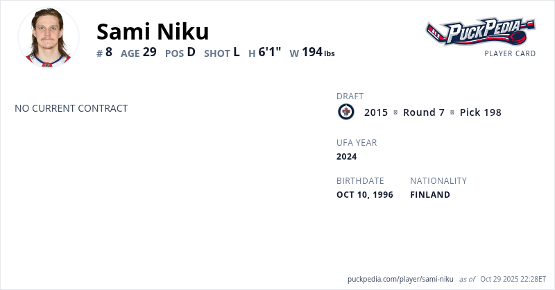 Sami Niku is an Unrestricted Free Agent. His last contract was 1 year, $750,000 with a cap hit of $750,000 per season. It expired at the end of the 2021-22 season.