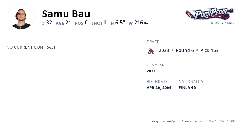 | 2024-25 | 20 | Liiga | Ilves | 40 | 4 | 6 | 10 | 16 | Playoffs | 9 | 1 | 4 | 5 | 0 | ||||||||||||||||