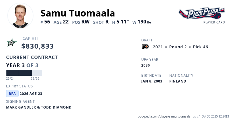 Samu Tuomaala is signed to a 3 year, $2,492,499 contract with a cap hit of $830,833 per season, playing for the Dallas Stars. His contract expires at the end of the 2025-26 season, making Tuomaala a Restricted Free Agent.