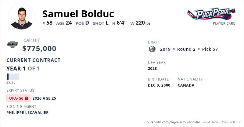 Samuel Bolduc is signed to a 1 year, $775,000 contract with a cap hit of $775,000 per season, playing for the Los Angeles Kings. His contract expires at the end of the 2025-26 season, making Bolduc an Unrestricted Free Agent (Group 6).