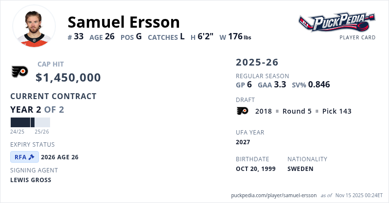 Samuel Ersson is signed to a 2 year, $2,900,000 contract with a cap hit of $1,450,000 per season, playing for the Philadelphia Flyers. His contract expires at the end of the 2025-26 season, making Ersson a Restricted Free Agent.