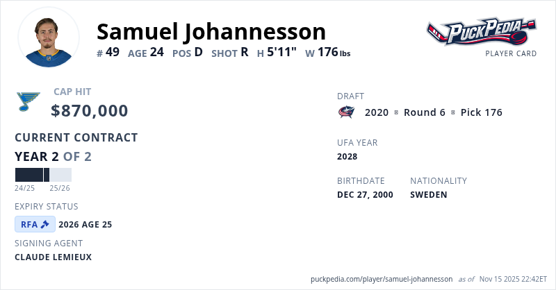 Samuel Johannesson is signed to a 2 year, $1,740,000 contract with a cap hit of $870,000 per season, playing for the St. Louis Blues. His contract expires at the end of the 2025-26 season, making Johannesson a Restricted Free Agent.