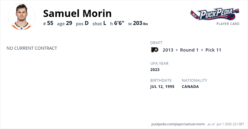 Samuel Morin is an Unrestricted Free Agent. His last contract was 1 year, $750,000 with a cap hit of $750,000 per season. It expired at the end of the 2021-22 season.