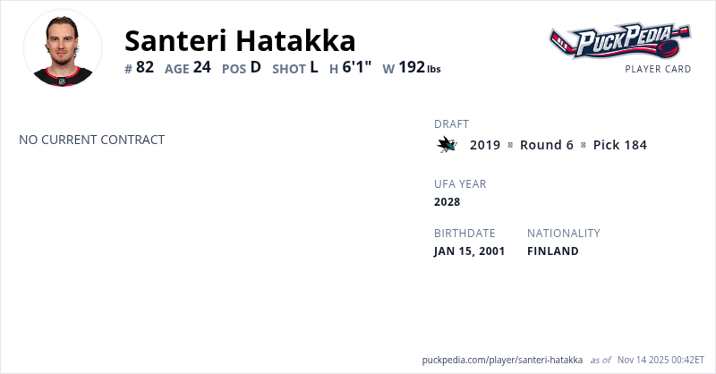 Santeri Hatakka is an Unrestricted Free Agent (No Qualifying Offer). His last contract was 1 year, $775,000 with a cap hit of $775,000 per season. It expired at the end of the 2024-25 season.