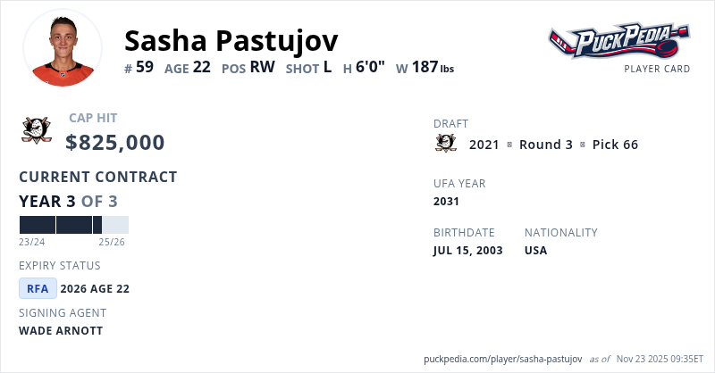 Sasha Pastujov is signed to a 3 year, $2,475,000 contract with a cap hit of $825,000 per season, playing for the Anaheim Ducks. His contract expires at the end of the 2025-26 season, making Pastujov a Restricted Free Agent.