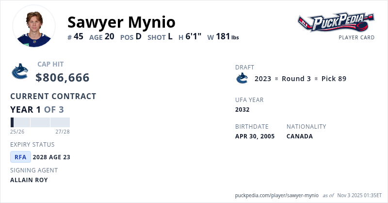 Sawyer Mynio is signed to a 3 year, $2,419,998 contract with a cap hit of $806,666 per season, playing for the Vancouver Canucks. His contract expires at the end of the 2027-28 season, making Mynio a Restricted Free Agent.