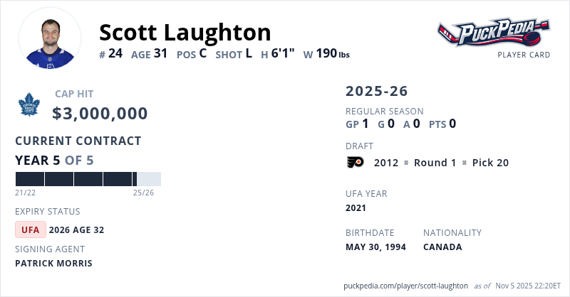 Scott Laughton is signed to a 5 year, $15,000,000 contract with a cap hit of $3,000,000 per season, playing for the Toronto Maple Leafs. His contract expires at the end of the 2025-26 season, making Laughton an Unrestricted Free Agent.