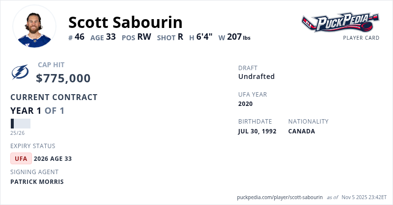 Scott Sabourin is signed to a 1 year, $775,000 contract with a cap hit of $775,000 per season, playing for the Tampa Bay Lightning. His contract expires at the end of the 2025-26 season, making Sabourin an Unrestricted Free Agent.