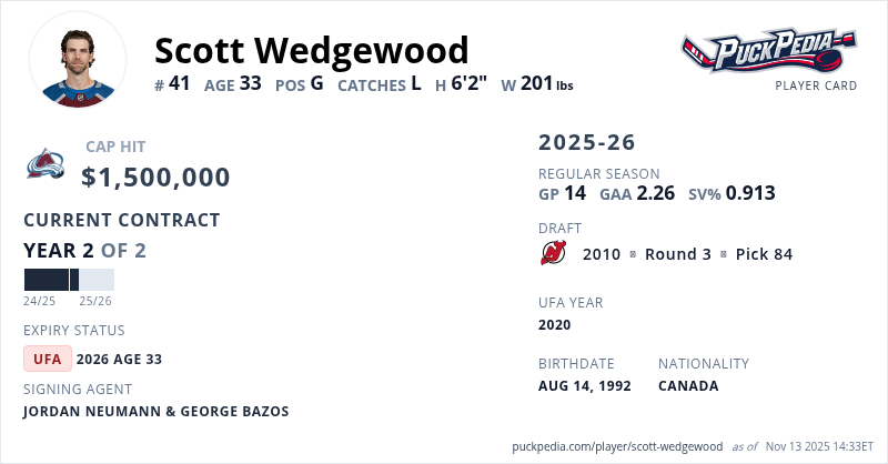 Scott Wedgewood is signed to a 1 year, $2,500,000 contract extension with a cap hit of $2,500,000 per season. He plays for the Colorado Avalanche. His next contract begins for the 2026-27 season and expires at the end of the 2026-27 season, making him an Unrestricted Free Agent.