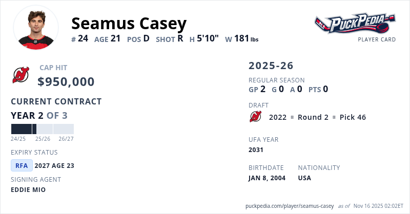 Seamus Casey is signed to a 3 year, $2,850,000 contract with a cap hit of $950,000 per season, playing for the New Jersey Devils. His contract expires at the end of the 2026-27 season, making Casey a Restricted Free Agent.
