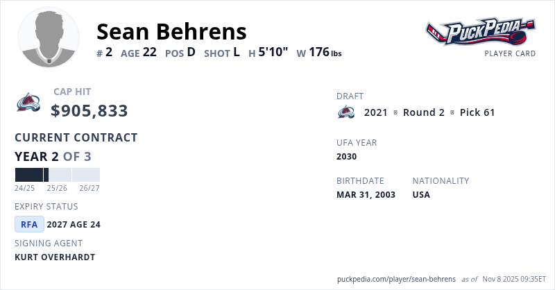 Sean Behrens is signed to a 3 year, $2,717,499 contract with a cap hit of $905,833 per season, playing for the Colorado Avalanche. His contract expires at the end of the 2026-27 season, making Behrens a Restricted Free Agent.