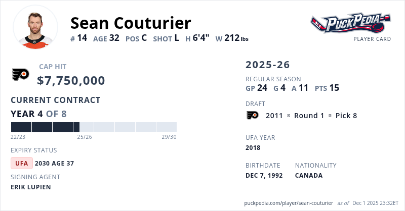 Sean Couturier is signed to a 8 year, $62,000,000 contract with a cap hit of $7,750,000 per season, playing for the Philadelphia Flyers. His contract expires at the end of the 2029-30 season, making Couturier an Unrestricted Free Agent.