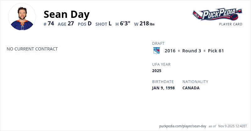Sean Day is an Unrestricted Free Agent (Group 6). His last contract was 1 year, $775,000 with a cap hit of $775,000 per season. It expired at the end of the 2023-24 season.