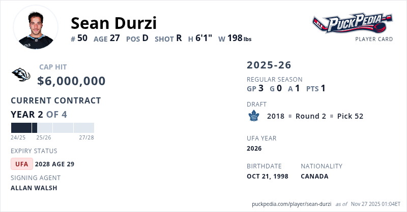 Sean Durzi is signed to a 4 year, $24,000,000 contract with a cap hit of $6,000,000 per season, playing for the Utah Mammoth. His contract expires at the end of the 2027-28 season, making Durzi an Unrestricted Free Agent.