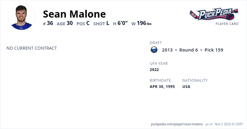 Sean Malone is an Unrestricted Free Agent. His last contract was 1 year, $750,000 with a cap hit of $750,000 per season. It expired at the end of the 2022-23 season.