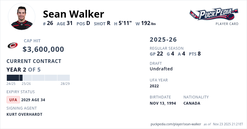 Sean Walker is signed to a 5 year, $18,000,000 contract with a cap hit of $3,600,000 per season, playing for the Carolina Hurricanes. His contract expires at the end of the 2028-29 season, making Walker an Unrestricted Free Agent.