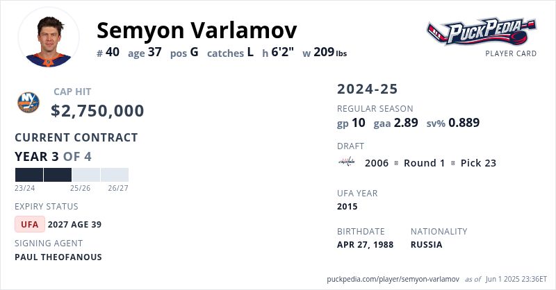 Semyon Varlamov is signed to a 4 year, $11,000,000 contract with a cap hit of $2,750,000 per season, playing for the New York Islanders. His contract expires at the end of the 2026-27 season, making Varlamov an Unrestricted Free Agent.