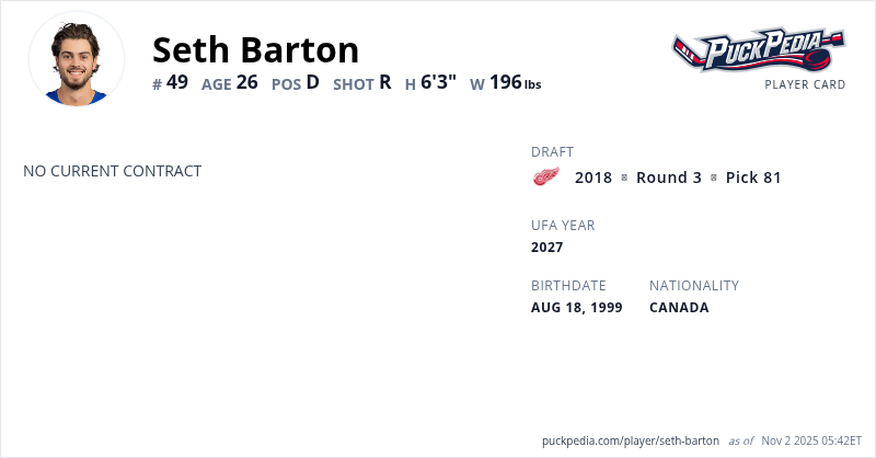 Seth Barton is an Unrestricted Free Agent (No Qualifying Offer). His last contract was 2 years, $1,665,000 with a cap hit of $832,500 per season. It expired at the end of the 2022-23 season.