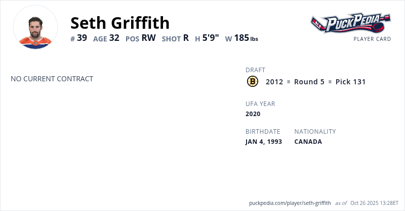 Seth Griffith is an Unrestricted Free Agent. His last contract was 2 years, $1,525,000 with a cap hit of $762,500 per season. It expired at the end of the 2023-24 season.