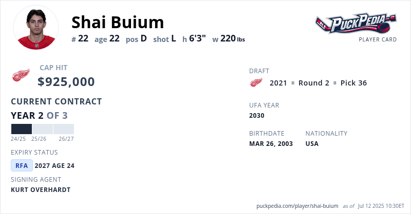 Shai Buium is signed to a 3 year, $2,775,000 contract with a cap hit of $925,000 per season, playing for the Detroit Red Wings. His contract expires at the end of the 2026-27 season, making Buium a Restricted Free Agent.