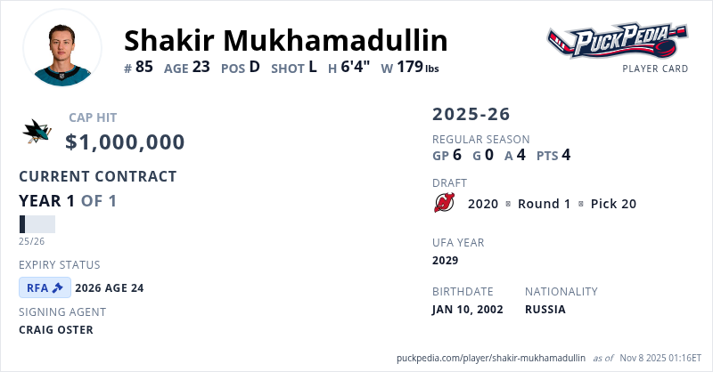 Shakir Mukhamadullin is signed to a 1 year, $1,000,000 contract with a cap hit of $1,000,000 per season, playing for the San Jose Sharks. His contract expires at the end of the 2025-26 season, making Mukhamadullin a Restricted Free Agent.
