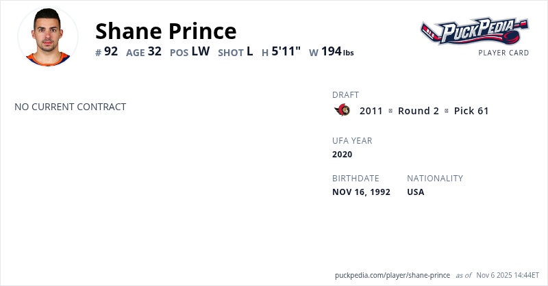 Shane Prince is an Unrestricted Free Agent (No Qualifying Offer). His last contract was 2 years, $1,700,000 with a cap hit of $850,000 per season. It expired at the end of the 2017-18 season.