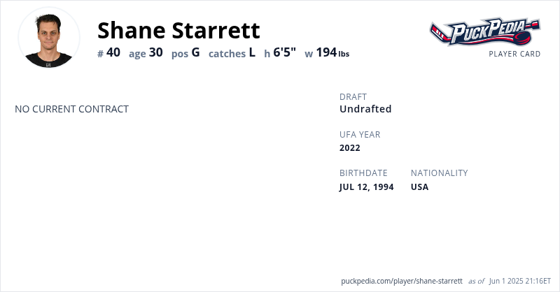 Shane Starrett is an Unrestricted Free Agent. His last contract was 1 year, $700,000 with a cap hit of $700,000 per season. It expired at the end of the 2019-20 season.