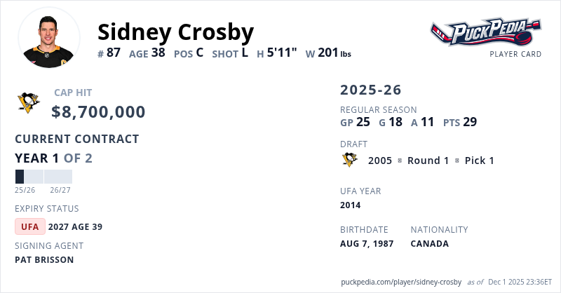 Sidney Crosby is signed to a 2 year, $17,400,000 contract with a cap hit of $8,700,000 per season, playing for the Pittsburgh Penguins. His contract expires at the end of the 2026-27 season, making Crosby an Unrestricted Free Agent.
