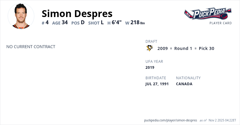 Simon Despres is an Unrestricted Free Agent. His last contract was 5 years, $18,500,000 with a cap hit of $3,700,000 per season. It expired at the end of the 2020-21 season.