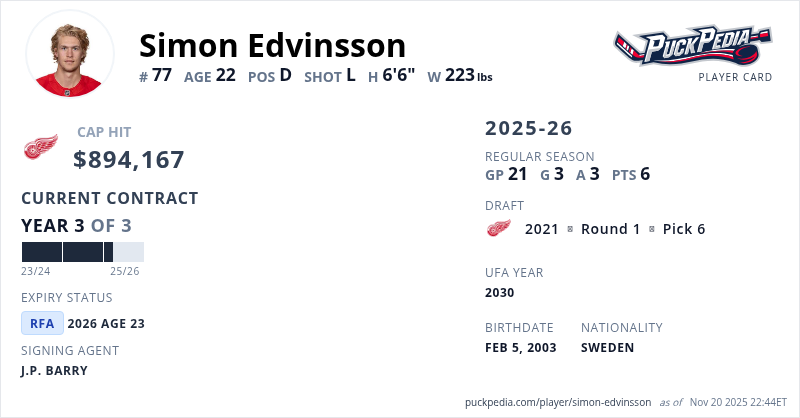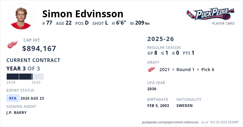 Simon Edvinsson is signed to a 3 year, $2,682,501 contract with a cap hit of $894,167 per season, playing for the Detroit Red Wings. His contract expires at the end of the 2025-26 season, making Edvinsson a Restricted Free Agent.
