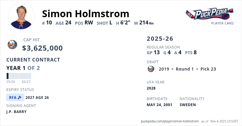 Simon Holmstrom is signed to a 2 year, $7,250,000 contract with a cap hit of $3,625,000 per season, playing for the New York Islanders. His contract expires at the end of the 2026-27 season, making Holmstrom a Restricted Free Agent.