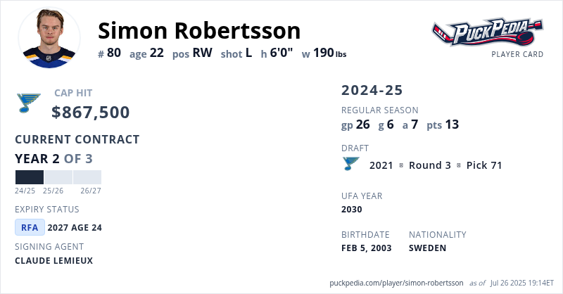 Simon Robertsson is signed to a 3 year, $2,602,500 contract with a cap hit of $867,500 per season, playing for the St. Louis Blues. His contract expires at the end of the 2026-27 season, making Robertsson a Restricted Free Agent.