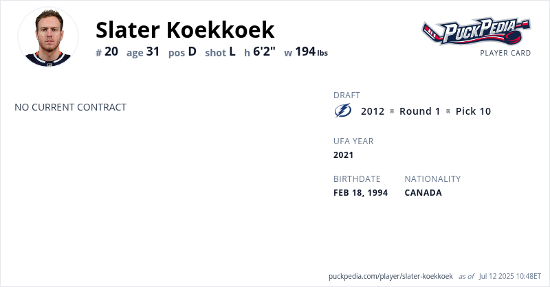 Slater Koekkoek is an Unrestricted Free Agent. His last contract was 2 years, $1,850,000 with a cap hit of $925,000 per season. It expired at the end of the 2022-23 season.