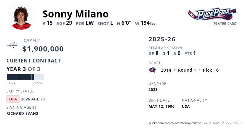 Sonny Milano is signed to a 3 year, $5,700,000 contract with a cap hit of $1,900,000 per season, playing for the Washington Capitals. His contract expires at the end of the 2025-26 season, making Milano an Unrestricted Free Agent.