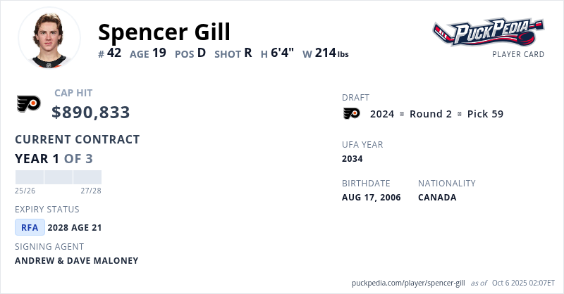 Spencer Gill is signed to a 3 year, $2,672,499 contract with a cap hit of $890,833 per season, playing for the Philadelphia Flyers. His contract expires at the end of the 2027-28 season, making Gill a Restricted Free Agent.