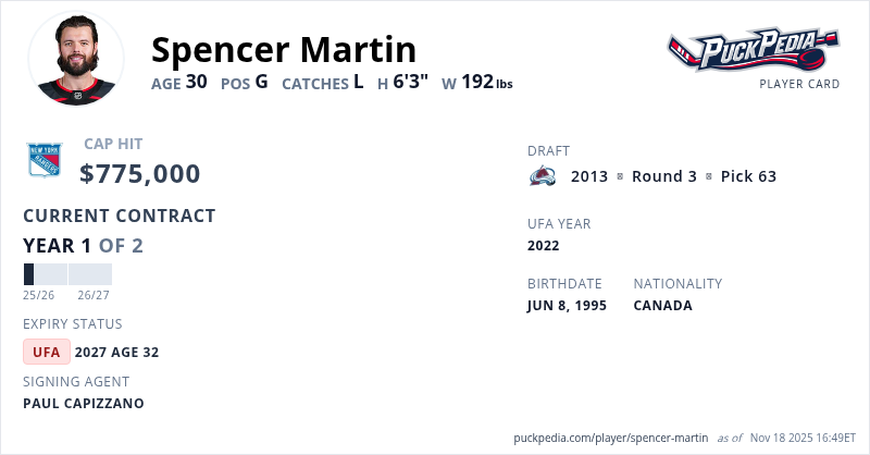 Spencer Martin is signed to a 2 year, $1,550,000 contract with a cap hit of $775,000 per season, playing for the New York Rangers. His contract expires at the end of the 2026-27 season, making Martin an Unrestricted Free Agent.
