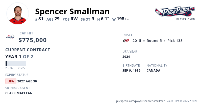 Spencer Smallman is signed to a 2 year, $1,550,000 contract with a cap hit of $775,000 per season, playing for the Washington Capitals. His contract expires at the end of the 2026-27 season, making Smallman an Unrestricted Free Agent.