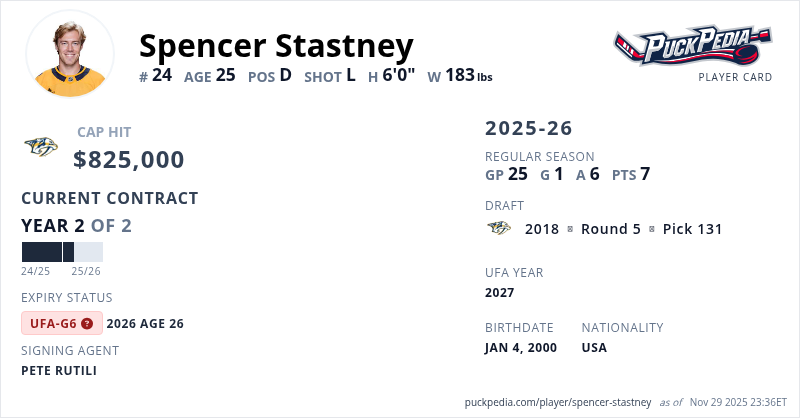 Spencer Stastney is signed to a 2 year, $1,650,000 contract with a cap hit of $825,000 per season, playing for the Nashville Predators. His contract expires at the end of the 2025-26 season, making Stastney an Unrestricted Free Agent (Group 6).