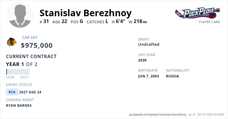 Stanislav Berezhnoy is signed to a 2 year, $1,950,000 contract with a cap hit of $975,000 per season, playing for the Chicago Blackhawks. His contract expires at the end of the 2026-27 season, making Berezhnoy a Restricted Free Agent.