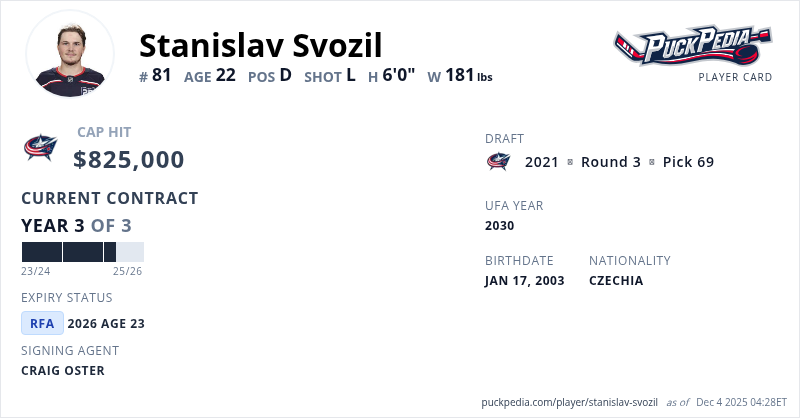 Stanislav Svozil is signed to a 3 year, $2,475,000 contract with a cap hit of $825,000 per season, playing for the Columbus Blue Jackets. His contract expires at the end of the 2025-26 season, making Svozil a Restricted Free Agent.