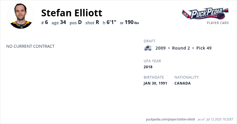 Stefan Elliott is an Unrestricted Free Agent. His last contract was 1 year, $650,000 with a cap hit of $650,000 per season. It expired at the end of the 2018-19 season.