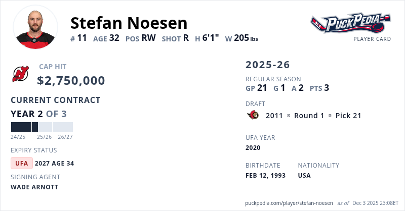 Stefan Noesen is signed to a 3 year, $8,250,000 contract with a cap hit of $2,750,000 per season, playing for the New Jersey Devils. His contract expires at the end of the 2026-27 season, making Noesen an Unrestricted Free Agent.