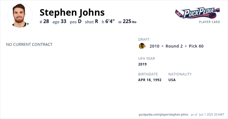Stephen Johns is an Unrestricted Free Agent. His last contract was 3 years, $7,050,000 with a cap hit of $2,350,000 per season. It expired at the end of the 2020-21 season.