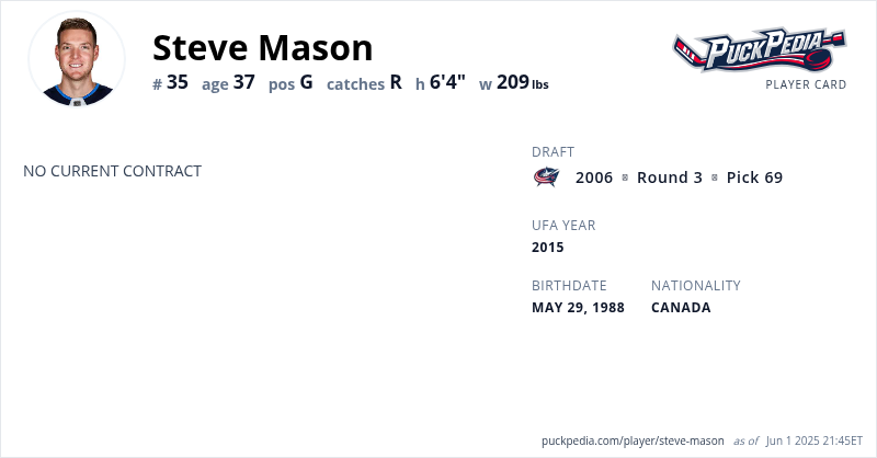 Steve Mason is an Unrestricted Free Agent. His last contract was 2 years, $8,200,000 with a cap hit of $4,100,000 per season. It expired at the end of the 2018-19 season.