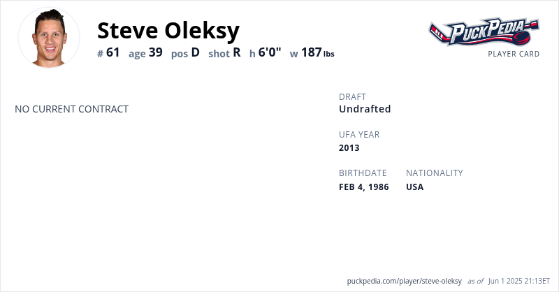 Steve Oleksy is an Unrestricted Free Agent. His last contract was 2 years, $1,300,000 with a cap hit of $650,000 per season. It expired at the end of the 2018-19 season.