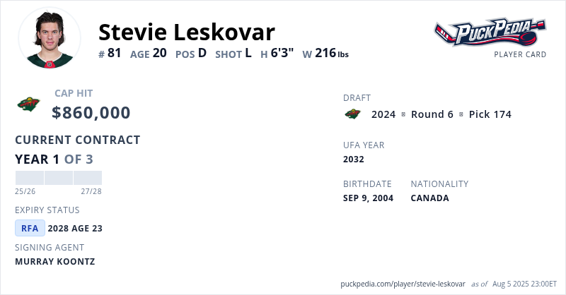 Stevie Leskovar is signed to a 3 year, $2,580,000 contract with a cap hit of $860,000 per season, playing for the Minnesota Wild. His contract expires at the end of the 2027-28 season, making Leskovar a Restricted Free Agent.