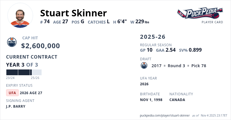 Stuart Skinner is signed to a 3 year, $7,800,000 contract with a cap hit of $2,600,000 per season, playing for the Edmonton Oilers. His contract expires at the end of the 2025-26 season, making Skinner an Unrestricted Free Agent.